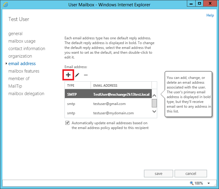 In the mailbox details, select email address on the left. The list on the right shows all of the email addresses assigned to the user. The SMTP addresses in this list represent all of the addresses which the user will be able to send as using Exchange Custom Sender. Use the plus button to add a new SMTP address.
